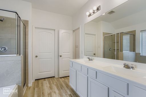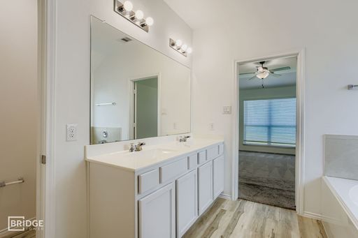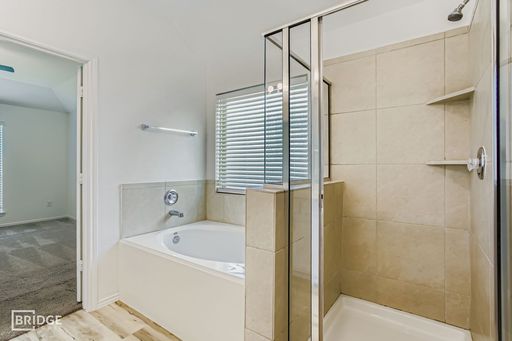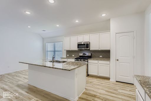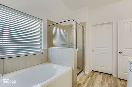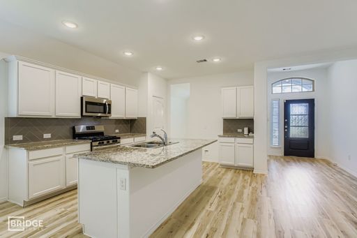 A bright, inviting foyer opens to a formal dining area and seamlessly flows into the open-concept living space. The kitchen is a focal point, featuring a generous island with seating, walk-in pantry, granite countertops, and an adjacent breakfast nook—ideal for family meals or casual entertaining. The spacious family room is anchored by abundant natural light and opens directly to a covered back patio, perfect for indoor-outdoor living and entertaining guests. The primary suite offers privacy and luxury, with dual vanities, a relaxing soaking tub, separate shower, enclosed toilet, and a large walk-in closet.